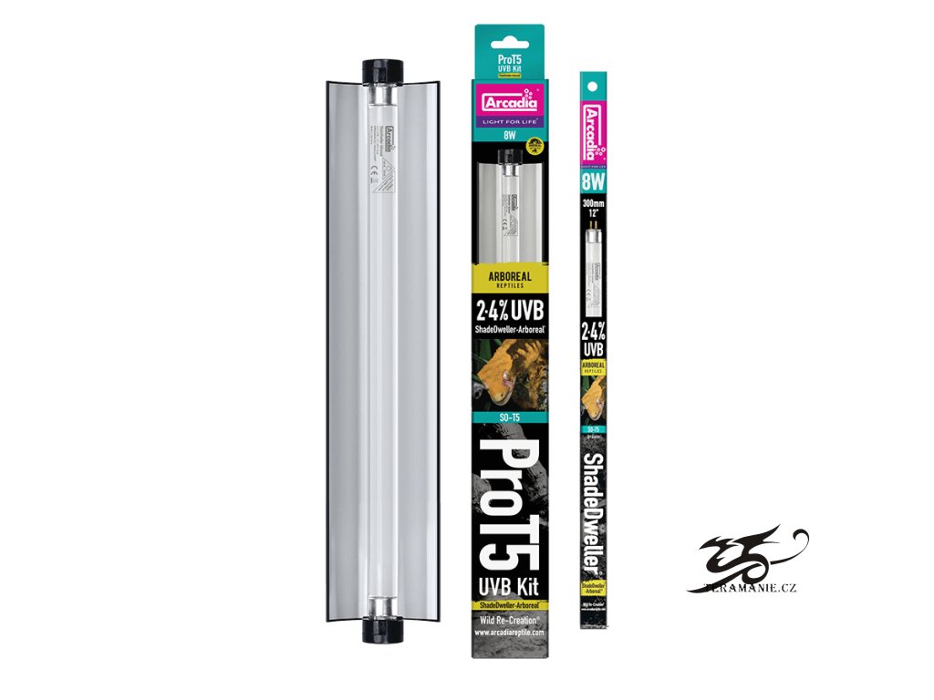 Kompletní osvětlovací těleso obsahuje zářivku T5 ShadeDweller Lamp Arboreal s optimálním výdejem 12% UVA a 2,4% UVB záření, 6000K. Arcadia PRO T5 UVB Kit je rovněž vybaven reflektorem, který nabízí dva úhly odrazu, zónu pro vyhřívání a rozprostření světla . Celý systém je konstruován tak, aby bylo možné zapojit za sebou až 10 jednotek, které budou napájeny z jednoho zdroje.